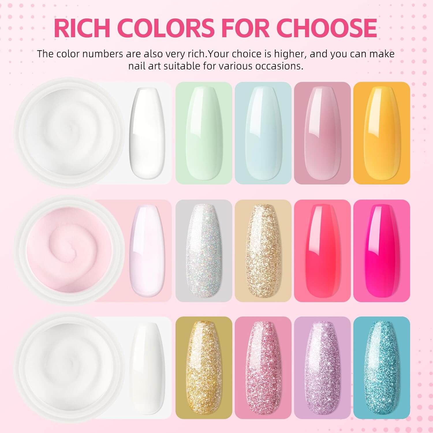 - Acrylic Powder & Glitter Powders: The acrylic nail kit comes with clear, pink, and white acrylic powders, which can be used for nail extension and nail carving. 24pcs nail decoration glitter: easy ways with different designs. Mix glitter and acrylic powder to get a new colour and style. The acrylic nail kit has a variety of colors, can meet a variety of creative needs. This acrylic nail kit is crafted with natural ingredients, ensuring gentle care that won't damage your nails.